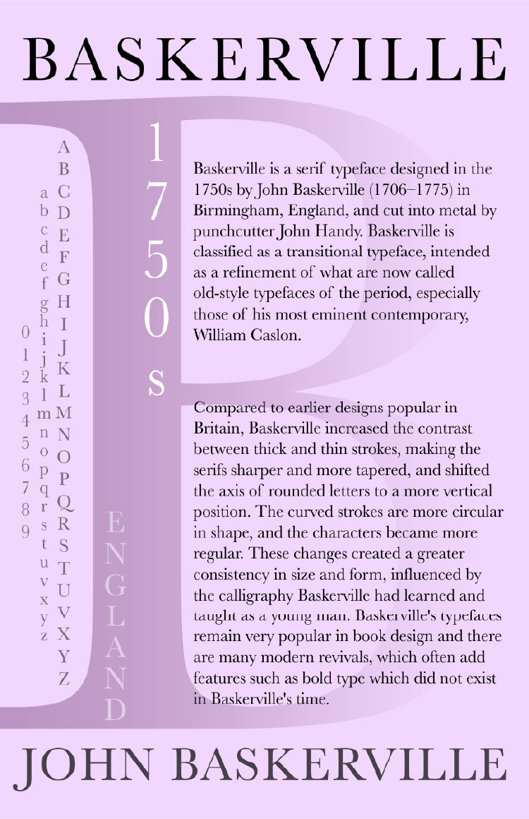 Project description: We were required to make a poster about the history of type using letters/typography. I chose to make a poster about the type Baskerville. I placed a big B that will guide the viewer’s eyes through the composition. Then I chose a lilac pastel color since it gave an “antique” vibe to my poster.